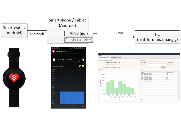 Im Rahmen der Veranstaltung Frameworkbasierte GUI-Entwicklung wurde das Projekt HeartRate2Go ausgearbeitet. HeartRate2Go ist ein Softwarepaket bestehend aus einer Desktop-PC Anwendung und einem Android Smartphone/Smartwatch App-Bundle zur Erfassung der Herzfrequenz für Ruhe- oder Aktivitätsmessungen. Die von der Smartwatch per Pulsoxymetrie gemessenen Herzfrequenz wird über das gekoppelte Smartphone zur Desktop-PC Anwendung übertragen und dort übersichtlich zusammen mit bereits getätigten Messungen dargestellt. HeartRate2Go unterstützt damit den Anwender bei der Kontrolle seines Pulses, auch über längere Zeiträume hinweg.
