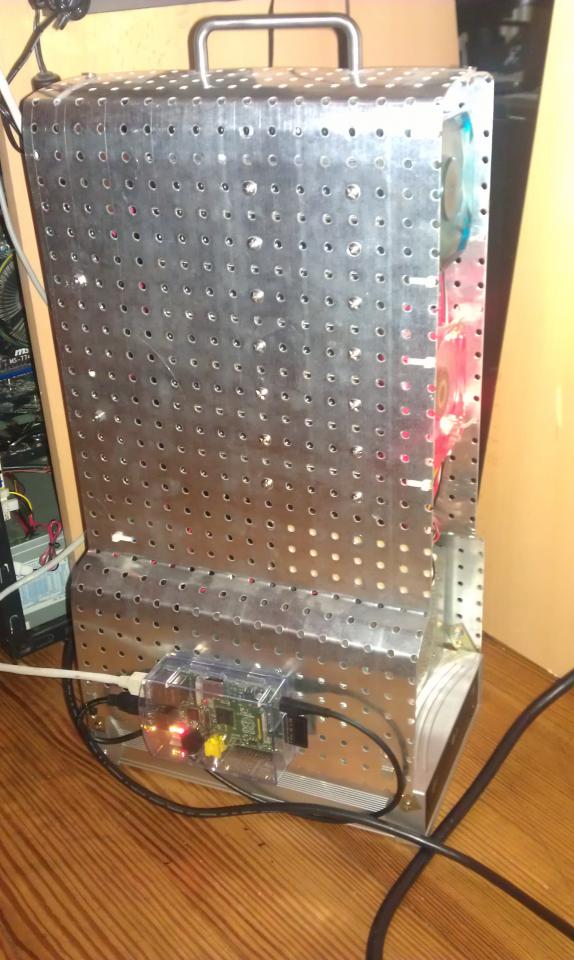 Alle Festplaten werden über einen S-ATA zu USB 2.0 Adapter an einen 10-Port USB-Hub angeschlossen, der widerrum mit einem Raspberry Pi Einplatinencomputer verbunden ist. Ein 300-Watt PC-Netzteil reicht für die Versorgung der Komponenten aus. Der Raspberry Pi abstrahiert die Verschlüsselung und bietet als angenehmer Nebeneffekt den Samba-Zugriff über Netzwerk an.