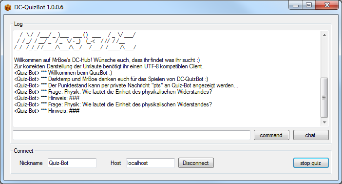 Der DC-Quizbot verbindet sich auf einen beliebigen Direct Connect Hub und beinhaltet einen Katalog von knapp 7000 Fragen, die er zufällig stellt und daraufhin richtige Antworten im Hub-Chat erkennt. Eine Highscore wird dabei angelegt und minimale zeitliche Verzögerungen angerechnet.